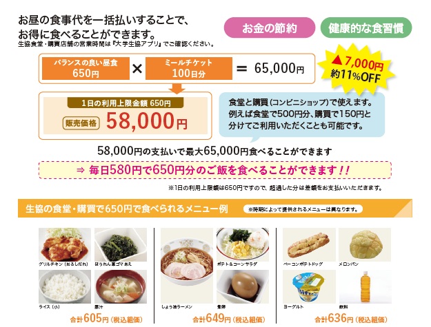 食費を削らず生協食堂や購買部できちんとバランスの良い食事ができます。毎日650円分きちんと食べる習慣が身につきます。(650円に満たなかった差額の繰り越しはできません)
