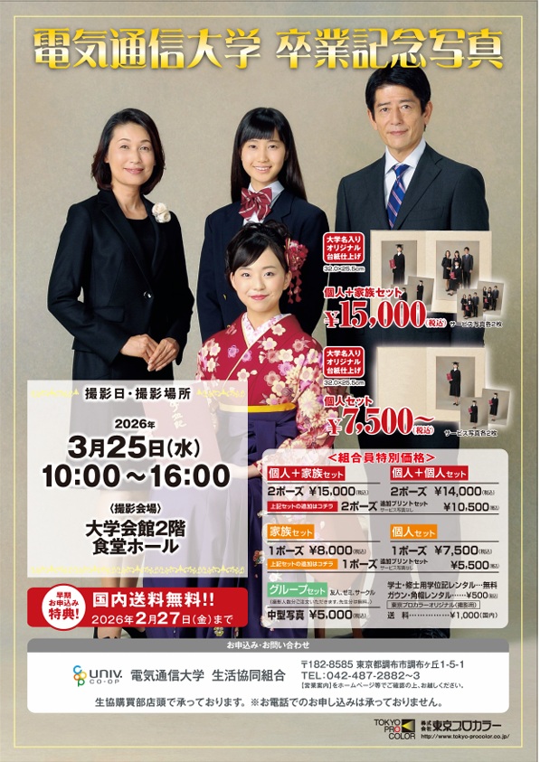 生協では例年、卒業式当日に生協食堂ホールで記念写真をお撮り頂けるようご提案をしております。